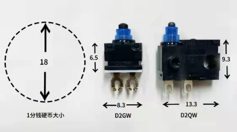 一分錢的硬幣直徑18mm,邊厚1.25mm,而D2GW開(kāi)關(guān)外形尺寸W8.3mm×D5.3mm×H6.5mm,可以說(shuō)是目前市面上體積非常小的開(kāi)關(guān)了。