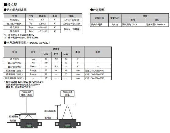 以上兩種光電傳感器有一個(gè)缺陷,即當(dāng)碰到透明物質(zhì)和液體時(shí),紅外線直接穿過(guò)相關(guān)物體,這就造成了槽式光電傳感器無(wú)法產(chǎn)生阻斷效果,反射式光電傳感器無(wú)法折射。為此,歐姆龍專門(mén)推出一款限定反射式光電傳感器如下: