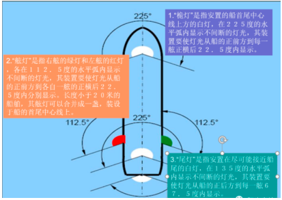 1、“桅燈”是指安置的船首尾中心線上方的白燈。