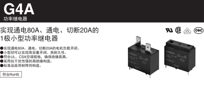 歐姆龍G4A系列繼電器,實(shí)現(xiàn)通電80A、通電、切斷20A的電機(jī)負(fù)載開(kāi)閉,1極小型功率繼電器,卻可以實(shí)現(xiàn)高容量開(kāi)閉、高耐久性。符合RoHS、EN/IEC(VDE認(rèn)證)、UL、CSA空調(diào)規(guī)格,確保絕緣距離,采用抗干擾性強(qiáng)的高絕緣構(gòu)造。標(biāo)準(zhǔn)品采用耐助焊劑構(gòu)造。