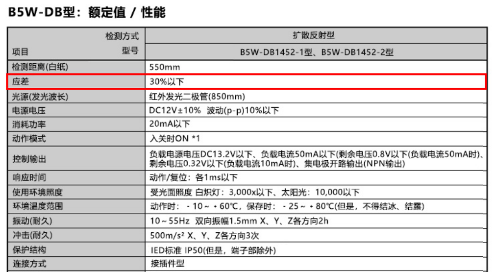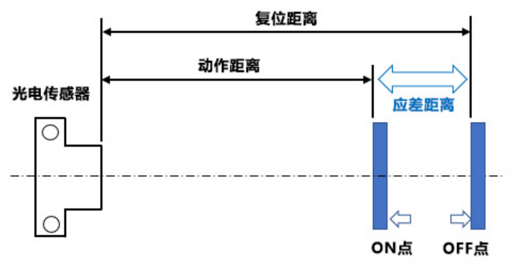 首先跟大家解釋下何為應(yīng)差,應(yīng)差簡而言之就是距離,那是哪里到哪里的距離呢?下文會為大家做一個詳細的舉例說明,其文字描述為反射型光電傳感器時間動作距離與復(fù)位距離之差,稱為“應(yīng)差”。