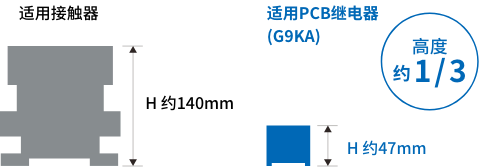 為了解決這個(gè)發(fā)熱課題而開(kāi)發(fā)的產(chǎn)品便是G9KA型高容量功率繼電器。G9KA在行業(yè)內(nèi)實(shí)現(xiàn)低接觸電阻0.2mΩ,有效抑制了作為小型化、高容量化重大課題的發(fā)熱。此外,與同等電流容量的接觸器相比,高度采用只有其1/3左右的緊湊型尺寸,有助于實(shí)現(xiàn)設(shè)備的小型化、省空間化。
