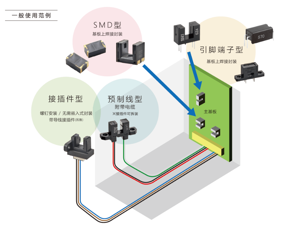 透過(guò)型微型光電傳感器中,發(fā)光元件的發(fā)光面和接受光線并發(fā)出信號(hào)的受光元件受光面相對(duì)而立,物體通過(guò)兩者的間隔,會(huì)遮住光線,引起受光元件受光量的變化。