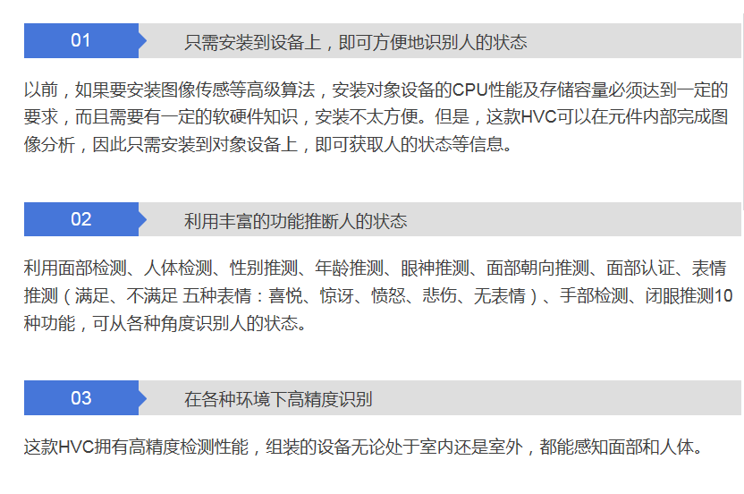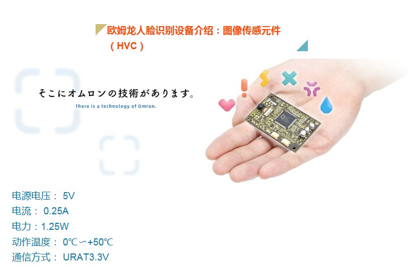 在人臉識(shí)別設(shè)備裝載型圖像傳感元件“HVC(Human Vision Components)”中,集成了面部認(rèn)證、表情推測(cè)、手部檢測(cè)等可以識(shí)別個(gè)人狀態(tài)的圖像傳感技術(shù)“OKAO Vision”,其中包括10種算法和相機(jī)模塊。只需裝載到現(xiàn)有的設(shè)備中,即可在原有功能的基礎(chǔ)之上,添加智能識(shí)別人臉的功能。