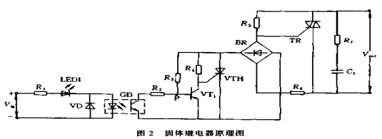 這里僅以應(yīng)用較多的交流過零型固體繼電器為例,介紹其工作原理。該電路采用了過零觸發(fā)技術(shù),具有電壓過零時開啟,負(fù)裁電流過零時關(guān)斷的特性,在負(fù)載上可以得到一個完整的正弦波形,因此電路的射頻干擾很小。該 電路由信號輸人電路、零電壓檢測控制電路、工作指示電路、雙向晶閘管控制電路和吸收電路幾部分組成。采用了光電耦合器GD作為輸入電路和輸出電路之間的隔離元件,VD是防止Vin正負(fù)接反燒壞GD。