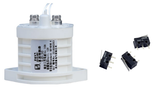 直流接觸器為了檢測主觸點的通斷情況,通常還設(shè)有一組輔助觸點,該組輔助觸點通常采用微動開關(guān)來實現(xiàn),也就是說,現(xiàn)有技術(shù)的這種直流接觸器設(shè)有一個微動開關(guān),用來檢測主觸點的通斷情況,實現(xiàn)該設(shè)計方案時,是在推動桿上裝有一撥動臂,在直流接觸器內(nèi)的對應(yīng)位置裝上述微動開關(guān),當推動桿帶動動簧運動使主動觸點和主靜觸點接觸時,推動桿同時帶動撥動臂運動,通過撥動臂觸動微動開關(guān)的動臂,使微動開關(guān)接通或斷開,通過直流接觸器的電路板對微動開關(guān)接通或斷開信號的檢測,從而實現(xiàn)對主觸點通斷情況的檢測。