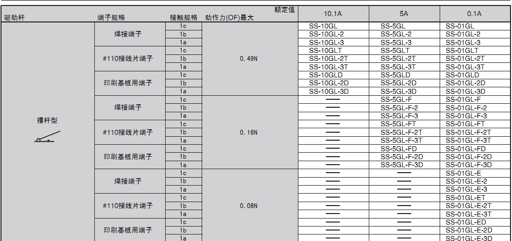 備有0.1A~10.1A型的各個品種,產(chǎn)品規(guī)格齊全,是歐姆龍暢銷的微動開關(guān)。