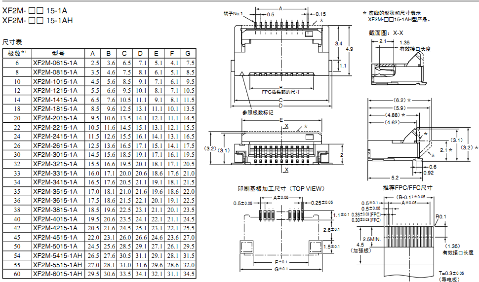 推薦FPC/FFC 厚度,t = 0.3 mm。鍍金型。