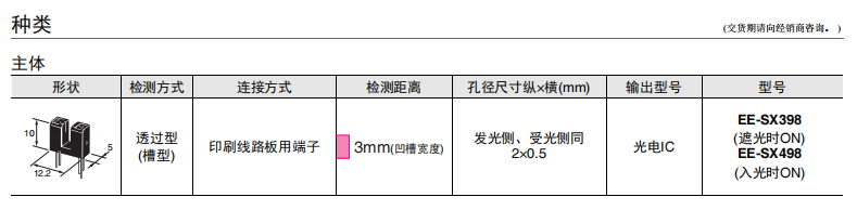 光電IC輸出(分為遮光時(shí)ON(EE-SX398)/入光時(shí)ON(EE-SX498) 2種類型)